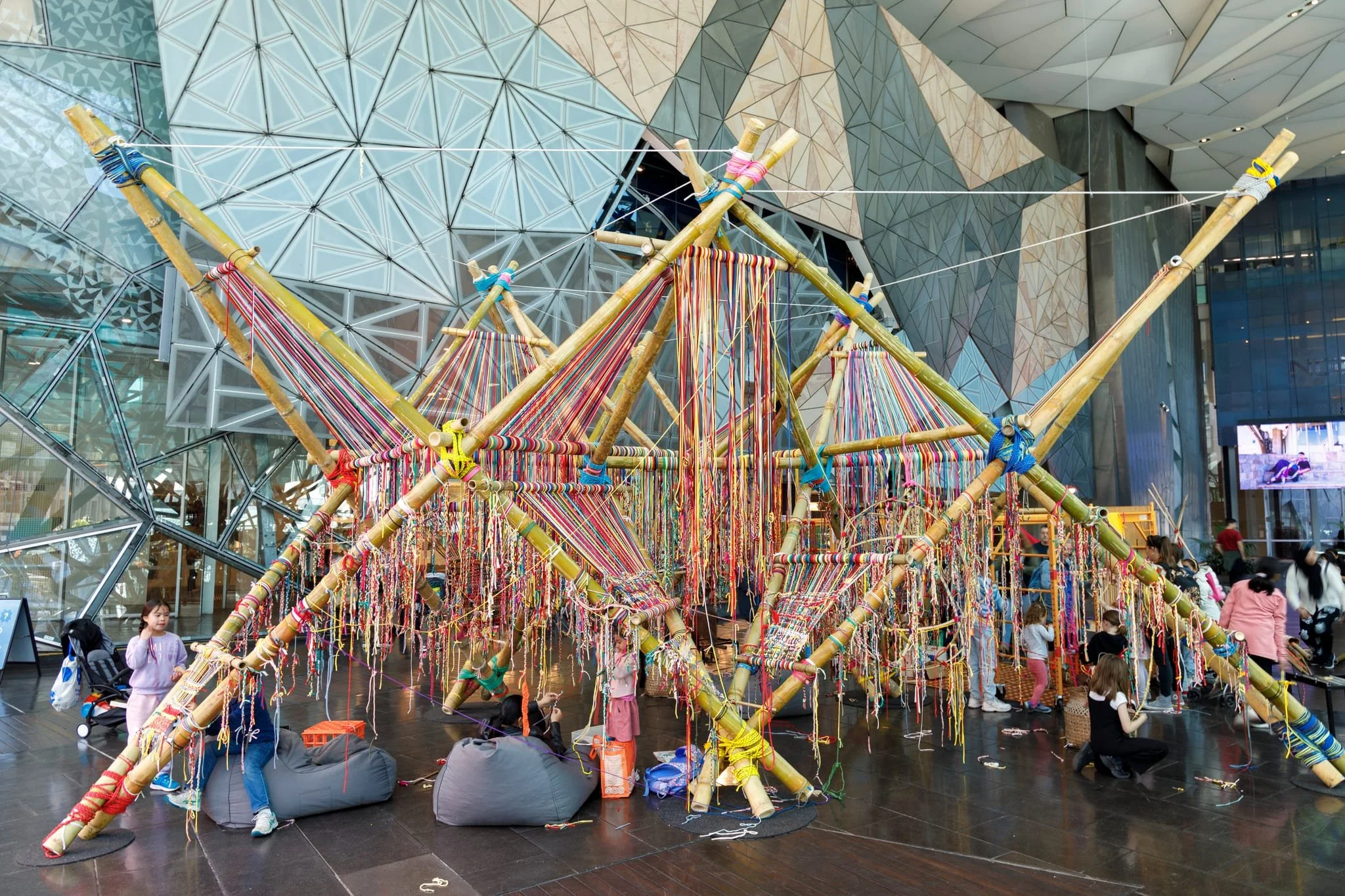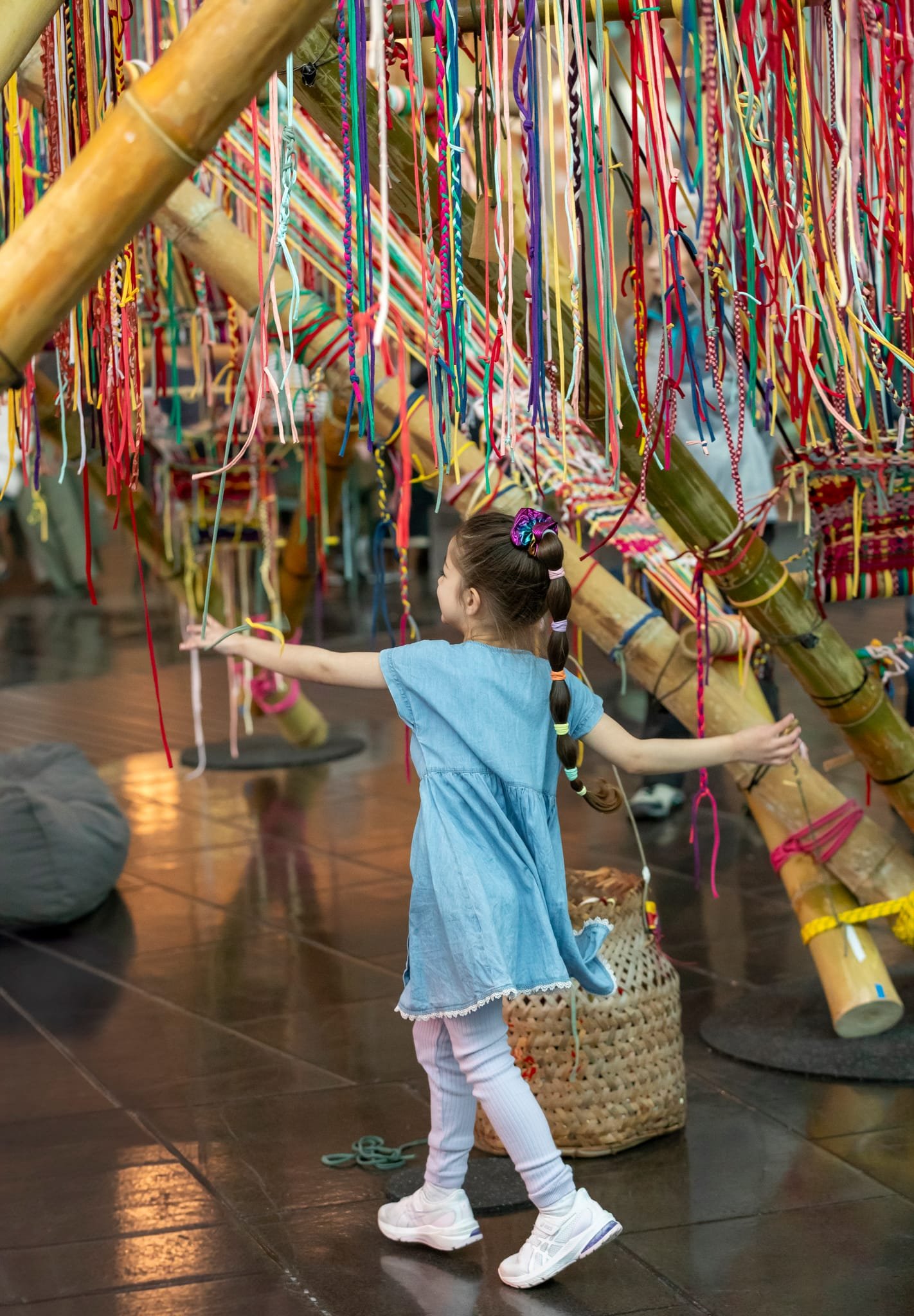 「自分は独りだ」という強い不安の中にいるとき、心は硬く閉ざされてしまうけれど、没頭して手を動かしていると、その自意識の壁が少しずつ透き通っていくのを感じる。 一本の糸が隣の人の糸と交差し、大きな織物になっていく。 私たちの小さな、些細なアクションが、この空間を、世界を、少しずつ変えていく。これを自分だけのものにするのではなく、他の人々へ開いていく。みながなにかをやっている微熱感を体感してさらに大きなものになっていく喜び。