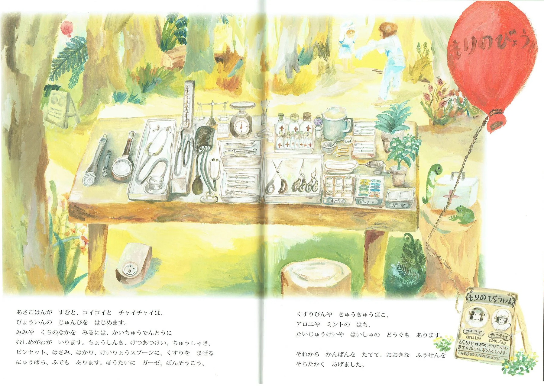 …ある夏の朝、おさるのコイコイとチャイチャイは、ユーカリの木が茂る森にやってきました。コイコイは医者で、チャイチャイは看護師です。「この森で病院を開きましょう」と、ふたりは聴診器や血圧計や注射器などを用意し、看板も立てて、大きな風船を空高くあげました。動物たちが集まってきました。タスマニアデビルのゴリゴリは、「歯がしみるんだ」といい、ウォンバットばあさんは「足腰が痛くて痛くて」といい、カンガルーのショーイは、足にとげを刺してしまいました……。コイコイとチャイチャイは次々と治療を行いますが、突然、「山火事だ!」「お母さんコアラと赤ちゃんがまだ木の上にいるんだよ、助けて!」と、叫び声が聞こえました。コイコイとチャイチャイは急いで山火事の現場へ向かいます……。オーストラリア在住の著者が、身近の森を舞台にしてつくったスリル満点の楽しい絵本です。